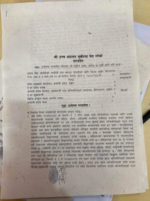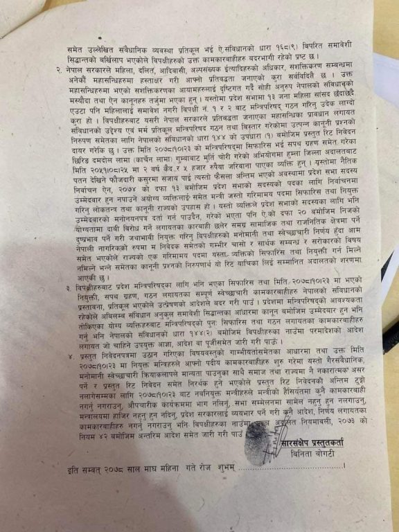 सुर्खेतका २० वर्षिया विनिता बोगटीले संविधानको समावेशी सिद्धान्तविपरीत बनेको मन्त्रिपरिषद् विघटन गरी समावेशी सिद्धान्त अनुरूप गठनको आदेश माग गर्दै रिट दायर गर्नु भएको हो । उहाँले सांसद नभएर पनि मन्त्री बनेका कार्चेन लामा मूर्ति चोरीको अभियोग प्रमाणित भई जेल सजाय काटेको व्यक्ति भएको भन्दै नैतिक पतन देखिने फैजदारी कसुर पाएका उहाँलाई मन्त्री पदबाट हटाउन माग गर्नु भएको छ ।