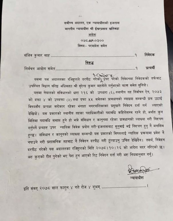 आदेशमा निवेदन दरपिठ गरेको सर्वोच्च अदालतको रजिष्ट्रारको माघ २६ गतेको आदेश बदर गरिएको उल्लेख छ । ‘स्थानीय तहका पदाधिकारीको पदावधि कहिलेसम्म रहने हो अर्थात् कुन मितिमा पदावधि समाप्त हुने हो भन्ने संविधान र कानूनमा रहेका प्रावधानको व्याख्या गरी निरुपण गर्नुपर्ने प्रश्नहरुउपर न्यायिक विवेक प्रयोग गरी इजलासबाट सुनुवाइ भई निरुपण हुनु नै मनासिव हुन्छ’, आदेशमा भनिएको छ, ‘संविधान र कानूनको व्याख्यासम्बन्धी यस प्रकारको विषयलाई न्यायिक प्रक्रियामा प्रवेश नै नपाउने गरी प्रशासनिक तहबाट नै निवेदन दरपिठ गरी टुङ्ग्याउने उचित देखिँदैन ।’