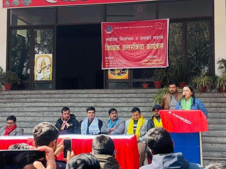 काठमाडौं – नेकपा एमालेनिकट अनेरास्ववियुले स्ववियु निर्वाचन गर्न माग गरेको छ। अनेरास्ववियु स्ववियु परिचालन विभागले निर्वाचनको दबाब दिन अन्तर्क्रिया समेत गरेको छ।