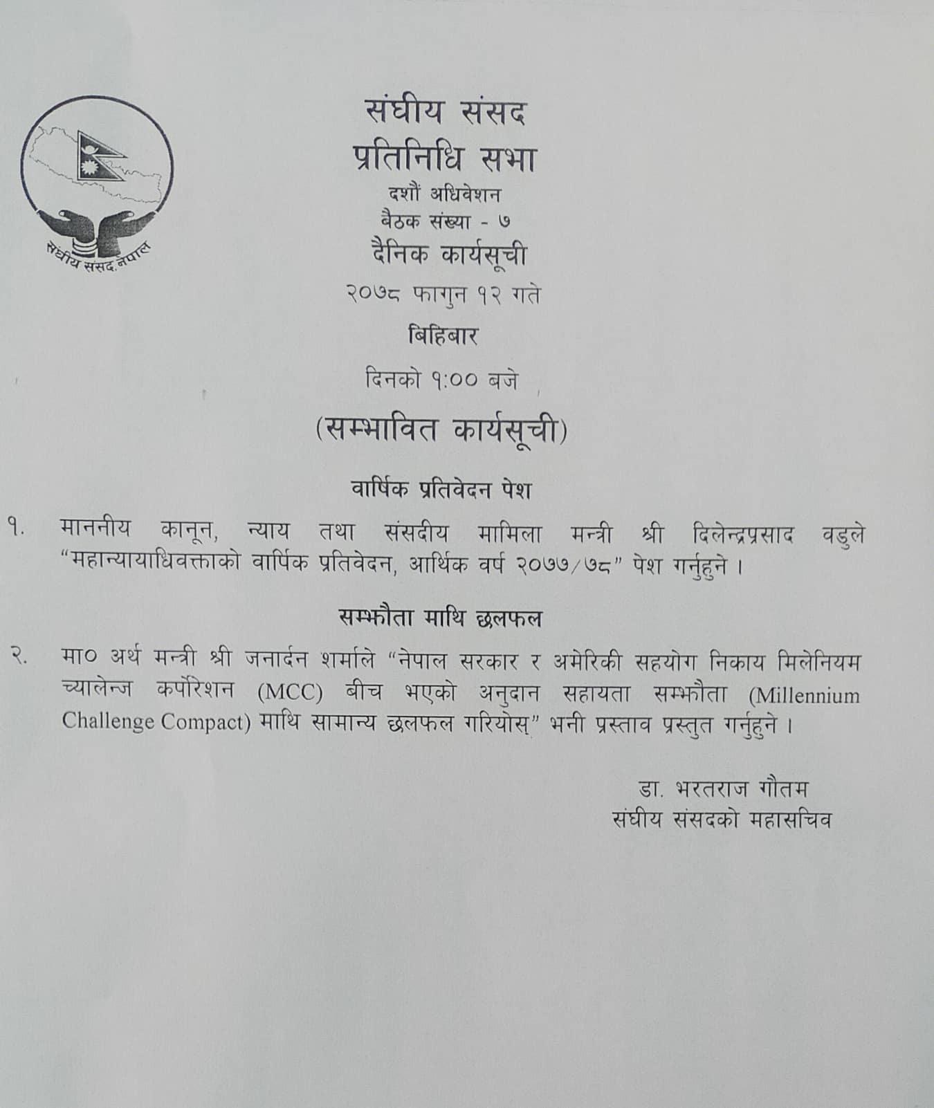 कार्यसूचीको दोस्रो बुँदामा अर्थमन्त्री जनार्दन शर्माले एमसीसीमाथि छलफल गरियोस् भनी प्रस्ताव गर्ने उल्लेख गरिएको छ ।