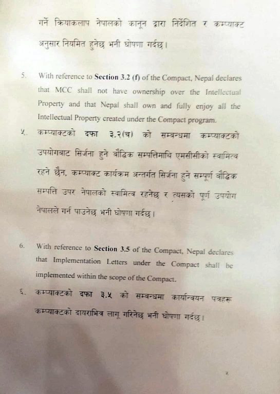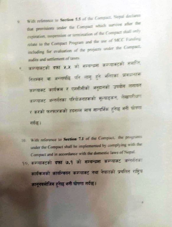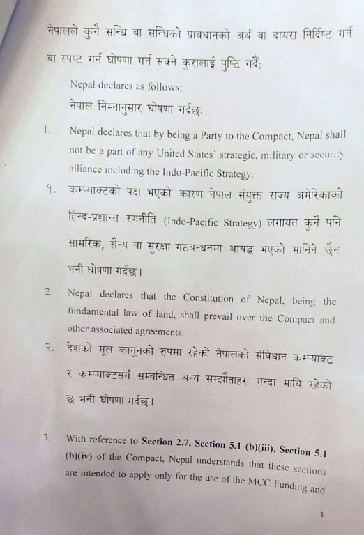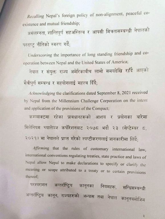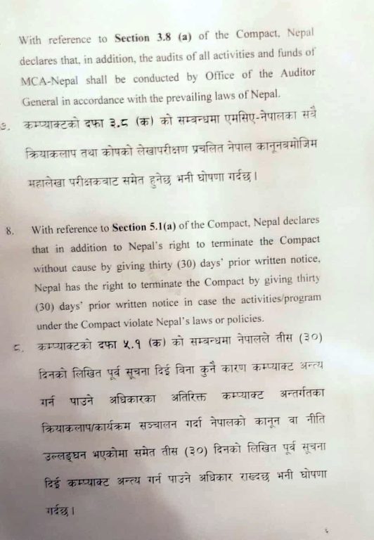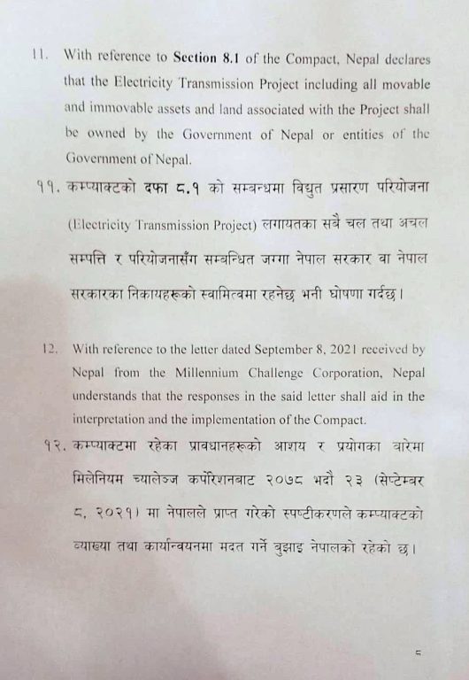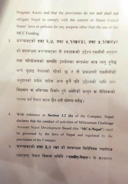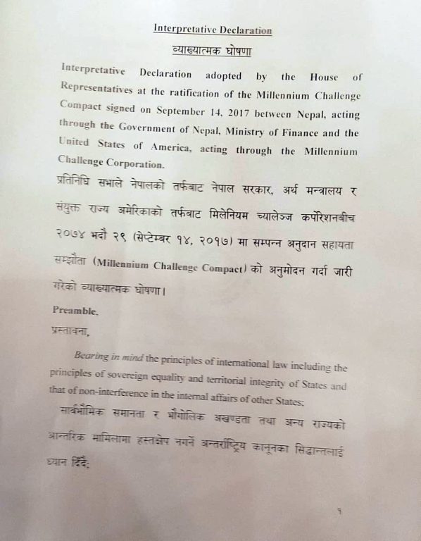 काठमाडौं – सरकारले संयुक्त राज्य अमेरिकाबाट लिन लागेको मिलेनियम च्यालेञ्ज कर्पोरेशन कम्याक्ट (एमसिसी) अनुदानसम्बन्धी ११ बुँदे व्याख्यात्मक घोषणा पारित गर्ने निर्णय गरेको छ ।