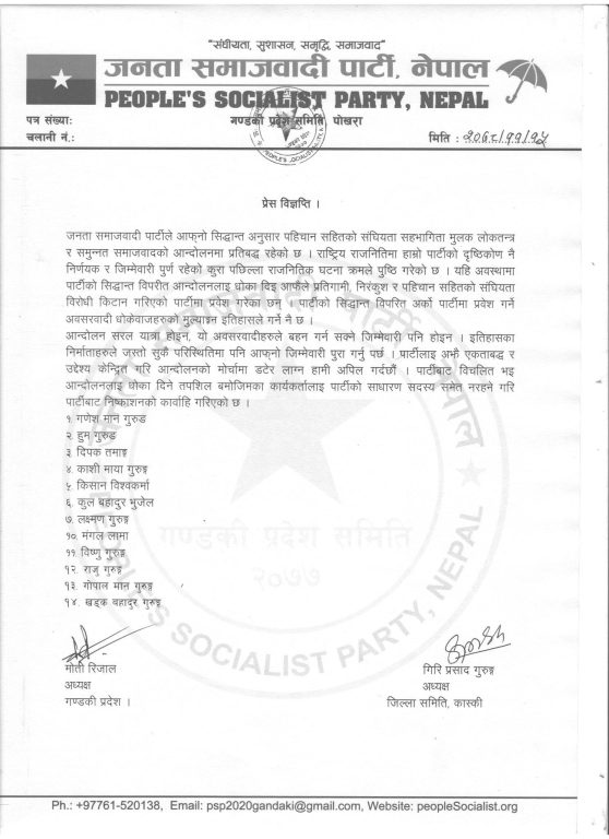 पार्टीको गण्डकी प्रदेश कमिटीले उनीहरूलाई निष्कासन गरेको हो । केही दिन पहिले जसपा त्यागेका १४ जनालाई साधारण सदस्यसमेत नरहने गरी निष्कासन गरिएको जसपाले जनाएको छ ।