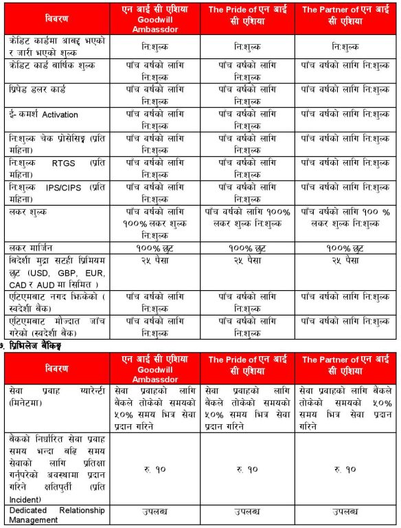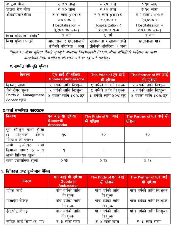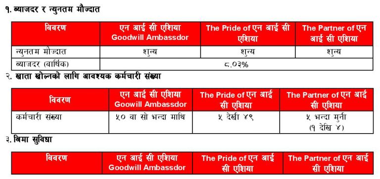 एनआइसी एशिया बैंकले हाल बैंकिङ्ग उद्योगमा रहेका तलबी खाताहरू मध्ये पनि अझ उत्कृष्ट सेवा सुविधाहरू भएको अतुलनीय एवं विशिष्ट तलबी खाताहरू सुरु गरेको जनाएको छ । ‘यस प्रकारका खाता मध्ये ३ प्रकारको सर्वश्रेष्ठ बीमा फाइदाहरू, ३ प्रकारको सर्वश्रेष्ठ कर्जा सम्बन्धी फाइदाहरू तथा १८ प्रकारको अन्य अतुलनीय सर्वश्रेष्ठ फाइदाहरू रहेका छन् ’ न्यौपाने भन्नुहुन्छ, ‘ग्राहकको बैंकिङ्ग आवश्यकतालाई गहन रुपमा अध्ययन विश्लेषण गरी सो आवश्यकताहरू परिपुर्ति गर्न, असिमित बैंकिङ्ग अनुभव प्रदान गर्न एवं हर्षमा वृद्धि गर्ने उद्धेश्यले बैंकले यो अफरमा मा थुप्रै प्रकारका विशेषताहरू थप गरेका छौं ।’ बैंकले प्रस्ताव गरेको सर्वश्रेष्ठ तलब खाता तीन भिन्न प्रकारका विशेषताहरूमा उपलब्ध छन् । जुन विविध प्रकारका संस्थाहरूको आ–आफ्नो विशिष्ट आवश्यकताहरू परिपुर्ति गर्नका लागि डिजाइन गरिएको हो ।