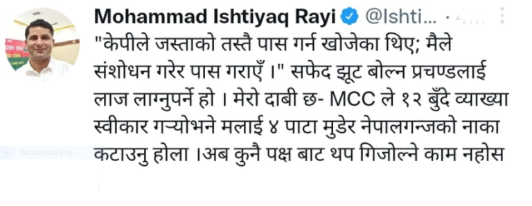 सामाजिक सञ्जालमा लेख्दै राईले यदी एमसीसीले १२ बुँदे स्वीकार गरेमा आफूलाई चारपाटा मुडेर नेपालगञ्जको नाका कटाउन चुनौती समेत दिनु भएको छ ।