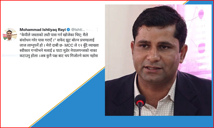 सामाजिक सञ्जालमा लेख्दै राईले यदी एमसीसीले १२ बुँदे स्वीकार गरेमा आफूलाई चारपाटा मुडेर नेपालगञ्जको नाका कटाउन चुनौती समेत दिनु भएको छ ।