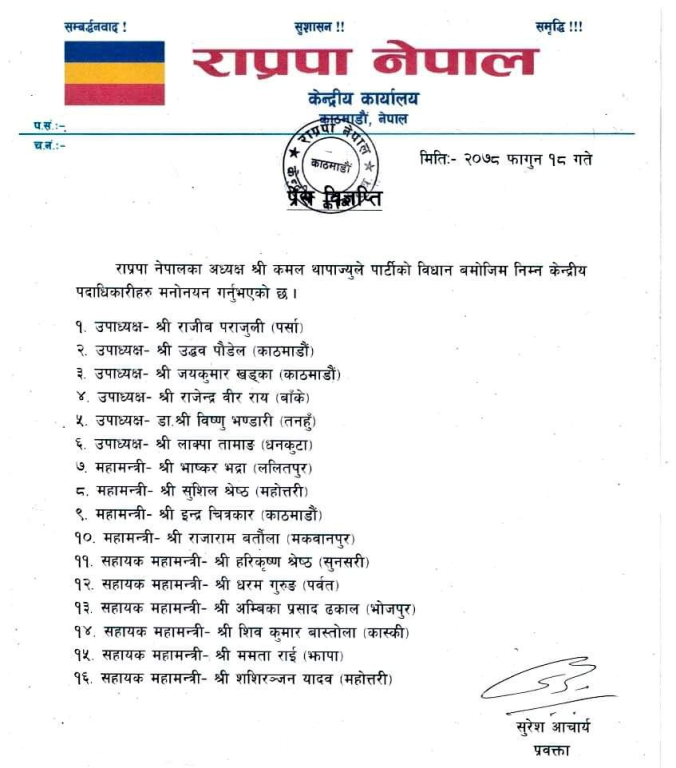 राप्रपा परित्याग गरी लाक्पा तामाङले गठन गरेको राप्रपा नेपालको नेतृत्व सम्हालेका अध्यक्ष थापाले ६ जना उपाध्यक्ष, चारजना महामन्त्री र ६ जना सहायक महामन्त्रीमा १६ जनालाई मनोनयन गरेका हुन् ।
