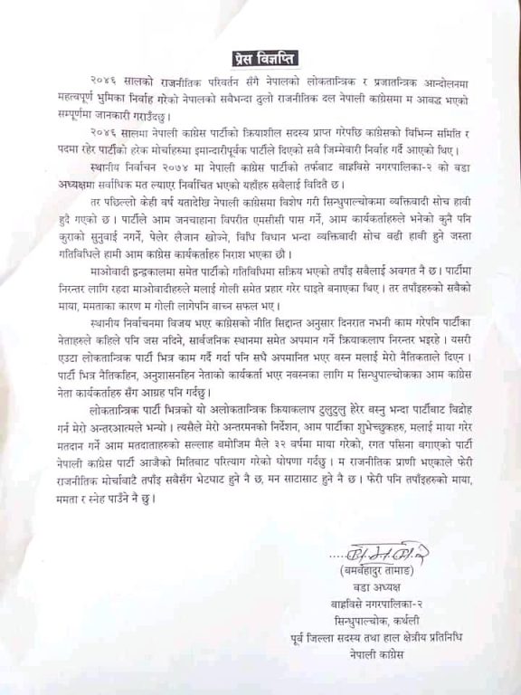 सिन्धुपाल्चोक – नेपाली काँग्रेस सिन्धुपाल्चोकका नेता तथा बाह्रविसे नगरपालिका–२ का अध्यक्ष बमबहादुर तामाङले पार्टी परित्यागको घोषणा गर्नुभएको छ । आज प्रेस विज्ञप्ति जारी गर्दै तामाङले नेपाली कांग्रेस परित्याग गरेको घोषणा गर्नुभएको हो ।