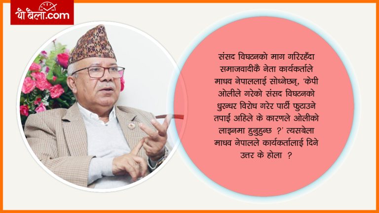 तर परिस्थितिहरुले माधव नेपाल यी मिठा सपनाहरु पूरा हुन दिने देखिदैन । किन कि संसद विघटनको माग गरिरहँदा समाजवादीकै नेता कार्यकर्ताले माधव नेपाललाई सोध्नेछन् ‘केपी ओलीले गरेको संसद विघटनको धुरन्धर विरोध गरेर पार्टी फुटाउने तपाईं अहिले के कारणले ओलीको लाइनमा हुनुहुन्छ ?’ त्यसबेला माधव नेपालले कार्यकर्तालाई दिने उत्तर के होला ? सबैको चासो छ ।