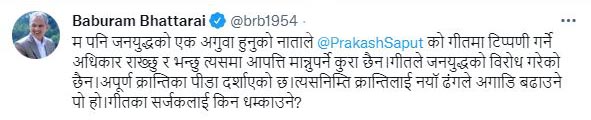 उहाँले ट्वीटरमा लेख्नु भएको छ, ‘म पनि जनयुद्धको एक अगुवा हुनुको नाताले प्रकाश सुपतको गीतमा टिप्पणी गर्ने अधिकार राख्छु र भन्छु त्यसमा आपत्ति मान्नुपर्ने कुरा छैन । गीतले जनयुद्धको विरोध गरेको छैन ।अपूर्ण क्रान्तिका पीडा दर्शाएको छ । त्यस निम्ति क्रान्तिलाई नयाँ ढंगले अगाडि बढाउने पो हो । गीतका सर्जकलाई किन धम्काउने ?’