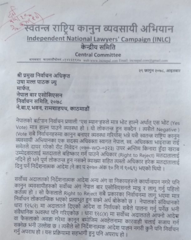 सो व्यवस्था नगरे सबै स्वरुपका अवज्ञा आन्दोलन गर्ने चेतावनी दिइएको पत्रमा यसअघि नै सर्वोच्च अदालतले कुनै पनि निर्वाचनमा मतदातालाई खराब उम्मेदवारलाई बहिष्कार पनि गर्न पाउने अधिकार राइट टु रिजेक्ट नहुने हो भने पूर्ण लोकतन्त्र हुन नसक्ने भनी नजिर स्थापित गरेकोले वकिलहरूको निर्वाचनमा सो व्यवस्था लागु हुनैपर्ने उल्लेख गरिएको छ ।