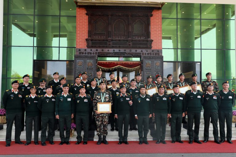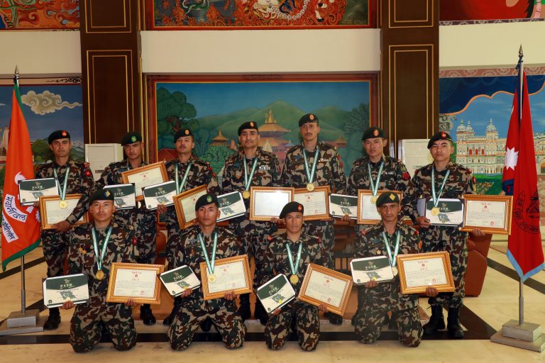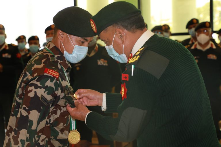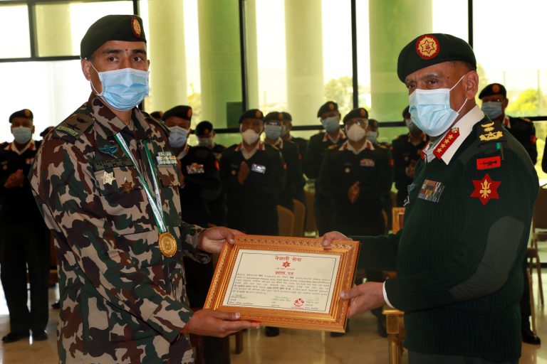 प्रधानसेनापति प्रभुराम शर्माले सैनिक मुख्यालय जङ्गी अड्डामा आयोजित समारोहमा प्रतियोगितामा स्वर्ण पदक विजेता नेपाली टोलीमा सहभागी अधिकृत, पदिक र अन्य दर्जालाई ‘प्रधान सेनापति प्रशंसा पदक’ प्रदान गर्नुभयो ।