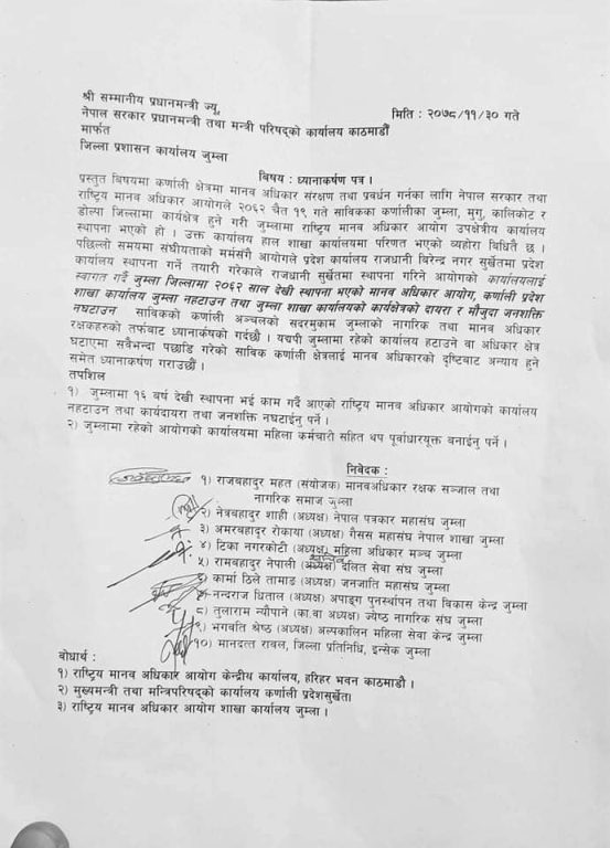 जुम्लाका क्रियाशील संघसंस्था मानव अधिकारकर्मीले प्रधानमन्त्री तथा मन्त्रिपरिषद्को कार्यालय, राष्ट्रिय मानव अधिकार आयोग काठमाडौँलाई जुम्ला प्रशासनमार्फत जुम्लास्थित आयोगको कार्यालयमार्फत ध्यानाकर्षण पत्र बुझाइएको हो ।
