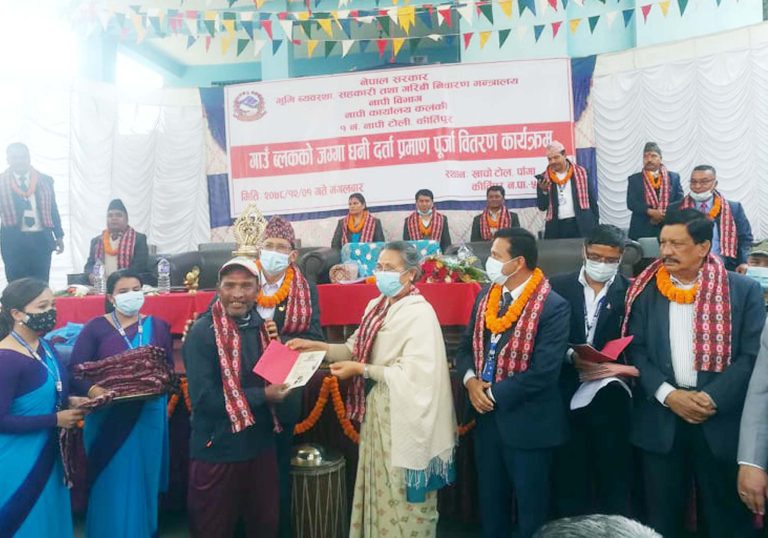 नापी विभागका महानिर्देशक प्रकाश जोशीले विसं २०२१ देखि रोकिएको गाँउ ब्लक नक्सासम्बन्धी समस्या सम्बोधन गर्ने सिलसिलामा जनमुखी कार्य गर्न पाएकामा विभागले गौरव महसुस गरेको प्रतिक्रिया दिनुभयो । सो अवसरमा ३२ परिवारलाई लालपूर्जा प्रदान गरियो । मन्त्रालयले गत कात्तिक १४ गतेयता महोत्तरी, सप्तरी, सिरहा, धनुषा, सुनसरी र काठमाडौँमा गरी करिब १५ हजारको हाराहारीमा गाउँ ब्लकसम्बन्धी पूर्जा वितरण गरेको छ ।