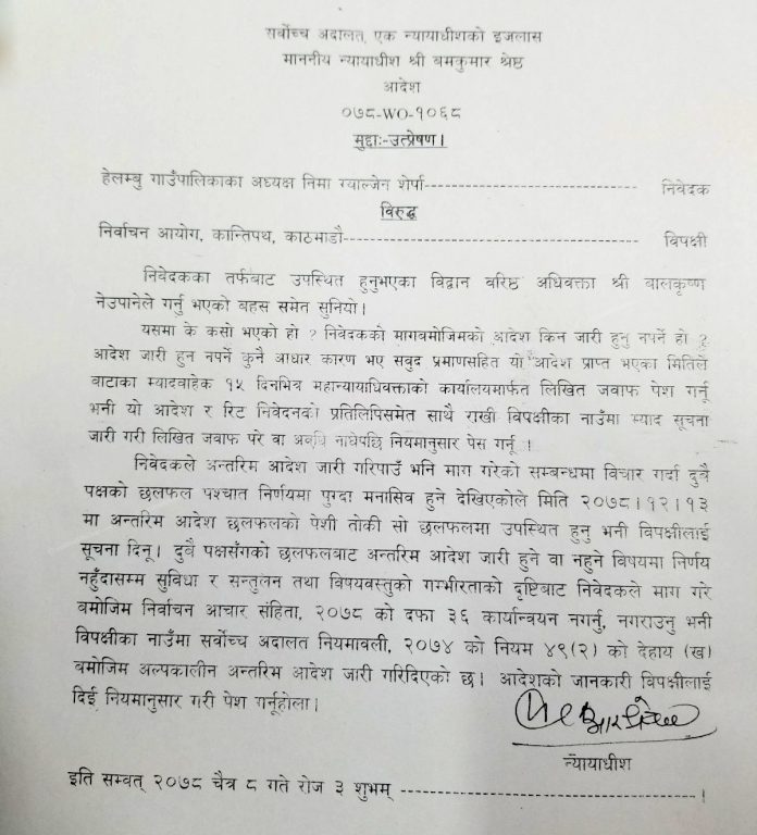 जनप्रतिनिधिले पदमा वहाल रहेर स्थानीय तहको निर्वाचनमा प्रतिस्पर्धा गर्न पाउनु पर्ने माग गर्दै सिन्धुपाल्चोकको हेलम्बु गाउँपालिकाका अध्यक्ष निमा ग्याल्जेन शेर्पाले निर्वाचन आयोगलगायतका निकायलाई विपक्षी बनाएर सर्वोच्चमा रिट दिनु भएको थियो ।
