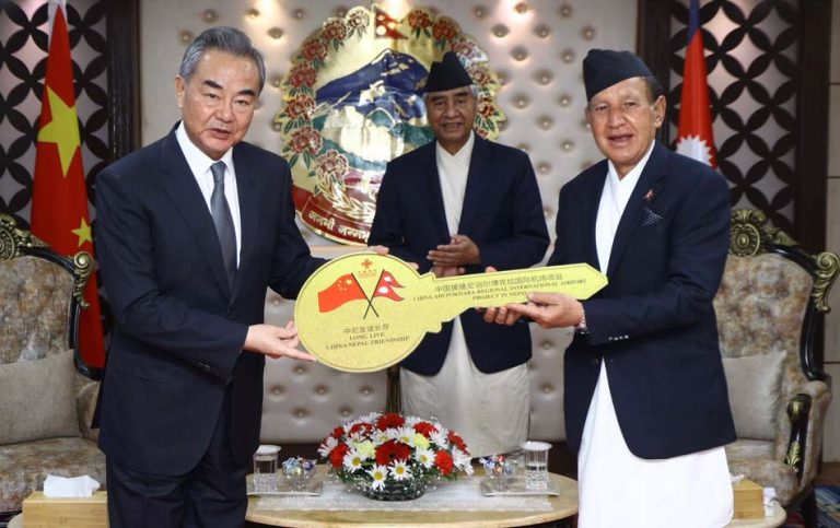 चिनियाँ विदेशमन्त्री वाङयीले परराष्ट्रमन्त्री नारायण खडकालाई विमानस्थल निर्माण सम्पन्नको चाबी हस्तान्तरण गर्नु भएको छ । यसअघि वाङले सिंहदरबारस्थित प्रधानमन्त्रीको कार्यालयमा परराष्ट्रमन्त्री खड्कासँग भेटवार्ता गर्नु भएको थियो ।सो भेटवार्तामा विभिन्न आर्थिक र प्राविधिक सहयोग विषयमा सम्झौता भएको थियो ।