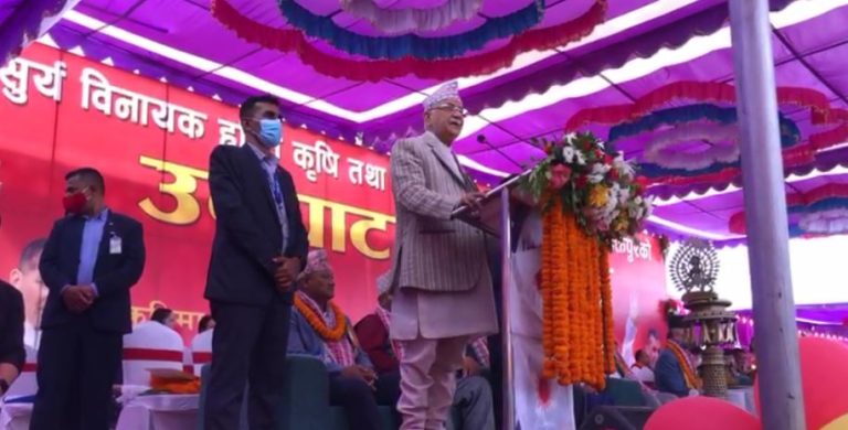 भक्तपुरको सूर्यविनायकमा नेपालकै ठूलो कृषि बजार उदघाटन गर्दै अध्यक्ष ओलीले भन्नुभयो, ‘अब नअल्मलिनुस्, एमालेमा आउनुस्, देश विकासमा सँगसँगै अघि बढौं ।’