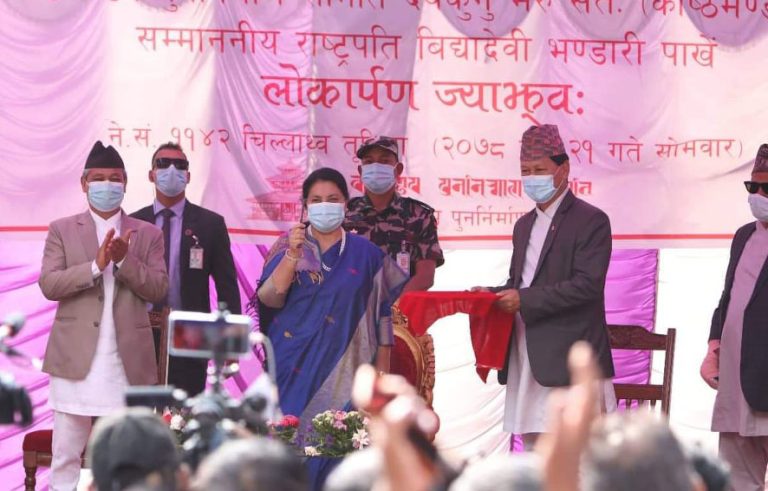 काठमाडौँ – राष्ट्रपति विद्यादेवी भण्डारीले भूकम्पपछि पुनः निर्माण सम्पन्न भएको ऐतिहासिक काष्ठमण्डप (मरुसतः) को लोकार्पण गर्नुभएको छ । काष्ठमण्डप परिसरमा आज आयोजित समारोहमा राष्ट्रपति भण्डारीलाई काठमाडौँ महानगरपालिकाका प्रमुख विद्यासुन्दर शाक्यले काष्ठमडपको साँचो हस्तान्तरण गरेपछि राष्ट्रपतिबाट साँचो प्रदर्शन गरी सोको लोकार्पण गरिएको हो ।