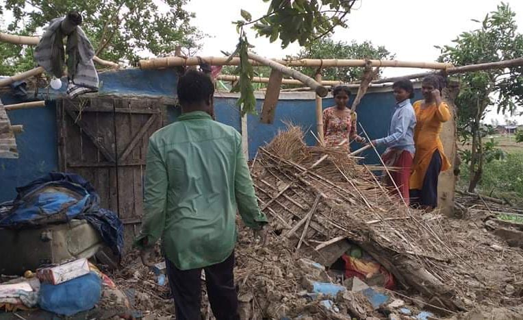 वडा नम्बर ७ मा एतवरी टुडू, कार्तिक राजवंशी, मेनी राजवंशी, वीरे राजवंशी, पवन राजवंशी लगायतको फुसको घर हावाले उडाएको हो। पवन राजवंशीका अनुसार अन्नपात भिजेर नष्ट भएको छ।