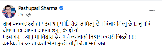 शर्माले सामाजिक सञ्जाल मार्फत भन्नुभएको छ, ‘लाज पचेकाहरुले हो गठबन्धन् गर्नी, सिद्दान्त मिल्नु छैन विचार मिल्नु छैन, चुनावी घोषणा पत्र आफ्ना आफ्ना छन्, के हो यो गठबन्धन, आफुमा बिश्वास छैन भने जनताको बिश्वास कसरी जित्छौ !!!कार्यकर्ता र जनता कति भेडा हुन्छौ सोच्नी बेला भयो अब ।’