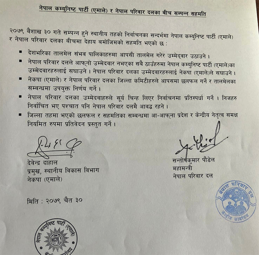 नेकपा एमालेका स्थानीय विकास विभाग प्रमुख देवेन्द्र दाहाल र परिवार दलका महामन्त्री सन्तोषकुमार पौडेलबीच गठबन्धन गर्ने सहमति भएको छ ।