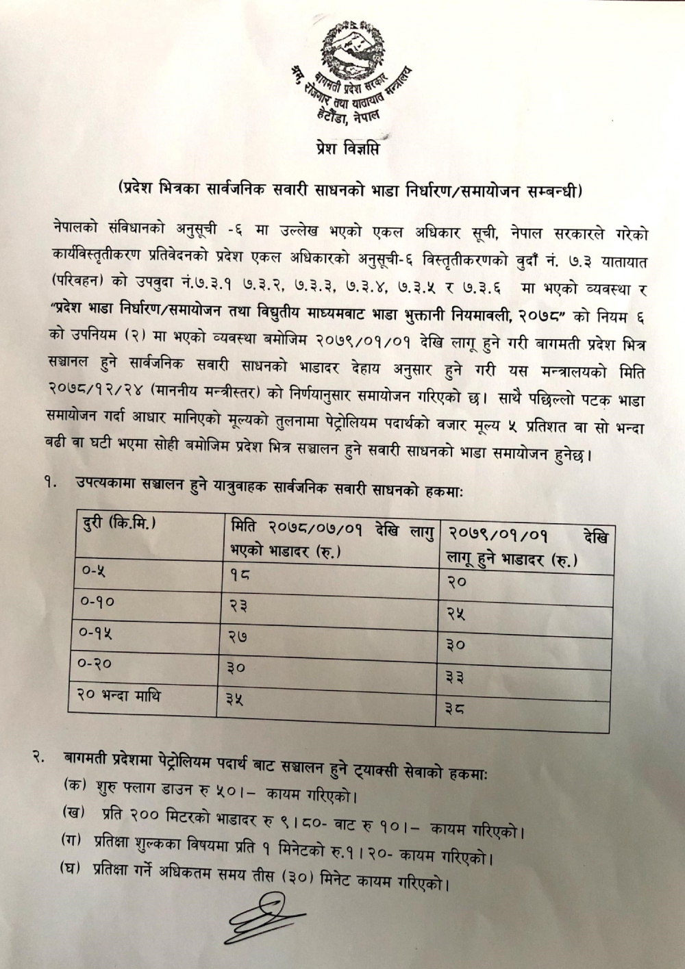 भाडा वृद्धिसँगै अब काठमाडौं उपत्यकामा सार्वजिक बस चढ्नेवित्तिकै २० रुपैयाँ लाग्नेछ । ५ किलोमिटर दूरीसम्म २० रुपैयाँ, १० किलोमिटर दूरीसम्म २५ रुपैयाँ भाडा तिर्नुपर्नेछ । त्यस्तै १० देखि १५ किलोमिटरसम्म ३० रुपैयाँ, १५ देखि २० किलोमिटरसम्म ३३ रुपैयाँ र २० किलोमिटरभन्दा धेरै यात्रा गर्दा ३८ रुपैयाँ भाडा तोकिएको छ वाग्मती प्रदेशमा चल्ने ट्याक्सीको पनि भाडा समायोजन गरएिको छ । पेट्रोलियम पदार्थबाट चल्ने र बिजुलीबाट चल्ने ट्याक्सीका हकमा छुट्टाछुट्टै भाडा कायम गरिएको छ ।