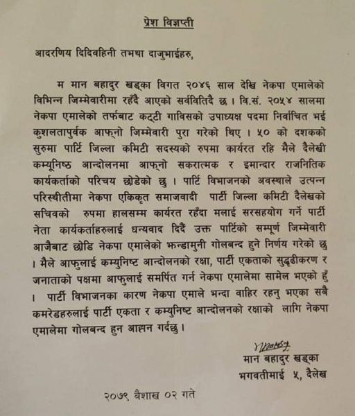 दैलेखको भगवतीमाई ५ निवासी खड्काले शुक्रबार प्रेस विज्ञप्ति जारी गर्दै आफू एमालेमा प्रवेश गरेको सार्वजनिक गर्नु भएको हो ।