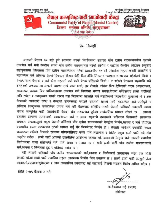 ‘वैशाख २ गतेको बैठकमा सहभागी सबै दलको तर्फबाट आ–आफनो धारणा राख्ने काम भयो । तर नेपाली कांग्रेसभित्र देखिएको चरम अन्तर कलह, गठबन्धन दलहरूबीच पालिकामा गर्ने विषयमा भएको सकस र कांग्रेसबाट हाम्रो पार्टीलाई अति उपेक्षा र अबमूल्यन गरेको कारण यस जिल्लामा सहमति गर्न नसकिएको निष्कर्षमा पुगिएको हो,’ राईले प्रेस विज्ञप्ति जारी गर्दै भनेका छन्, ‘उक्त विषयको जानकारी प्रदेश र केन्द्रको संयन्त्रलाई गराउने सहमति भएको साथै गठबन्धन भने नतोड्ने र अन्तिम विन्दुसम्म सहमतिको प्रयास गर्ने गरी बैठकबाट बाहिरिएलगत्तै कांग्रेसले एकतर्फी रुपमा माओवादीसँग गठबन्धन टुटेको घोषणा गरेको छ ।’