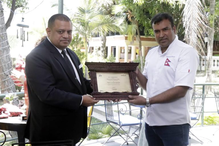 काठमाडौंमा आज आयोजित एक कार्यक्रमकाबीच ‘मास्टर सेफ सन्तोष साह’को साथमा सेफ एलेक्स वेब, सेफ बार्ट भान डेर ली र सेफ फिलि आर्मिटेज लगायतको टोलीलाई सम्मान गरिएको हो । बोर्डका कार्यकारी प्रमुख डा. धनञ्जय रेग्मी, बोर्ड सदस्य ङिमा नुवा शेर्पा, मिलन देवकोटा, वरिष्ठ निर्देशक नन्दिनी लाहे थापा, निर्देशक मणिराज लामिछानेलगायतले सेफ टोलीलाई सम्मान गर्नुभएको थियो ।