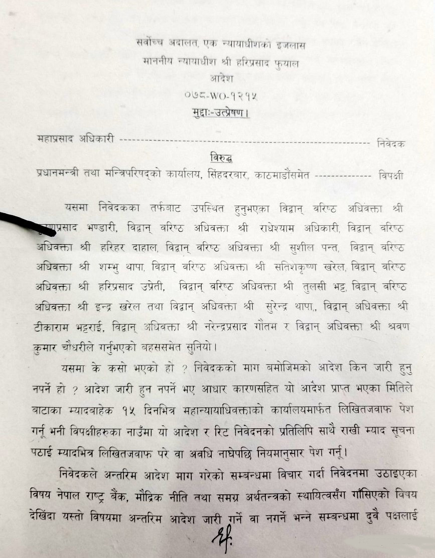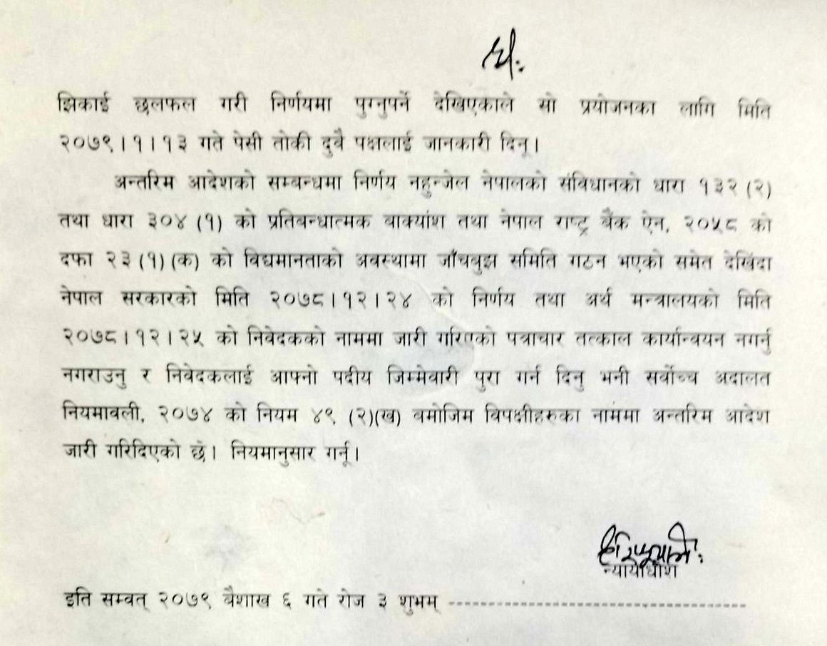 ‘निवेदकले अन्तरिम आदेश माग गरेको सम्बन्धमा विचार गर्दा निवेदनमा उठाइएका विषय नेपाल राष्ट्र बैंक, मौद्रिक नीति तथा समग्र अर्थतन्त्रको स्थायित्वसँग गाँसिएको विषय देखिँदा यस्तो विषयमा अन्तरिम आदेश जारी गर्ने वा नगर्ने भन्ने सम्बन्धमा दुवै पक्षलाई झिकाई छलफल गरी निर्णयमा पुग्नुपर्ने देखिएकाले सो प्रयोजनका लागि मिति २०७९ । १ । १३ गते पेसी तोकी दुवै पक्षलाई जानकारी दिनू’, भनिएको छ ।