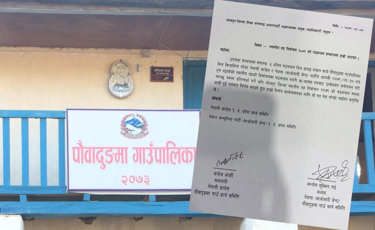 सत्तारुढ गठबन्धनको जिल्लास्तरीय संयन्त्रले मंगलबार सिट बाँडफाँट गरेको थियो । गाउँ कार्य समिति कांग्रेसका अध्यक्ष मनोज कार्की र माओवादी अध्यक्ष सन्तोष मुक्मिन राईले संयुक्त विज्ञप्ति निकालेर पौवादुङमामा गठबन्धन नगरी आ–आफ्ना दलबाट उम्मेदवार मनोनयन गर्ने निर्णय गरिएको उल्लेख गरेका छन् ।