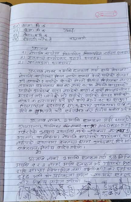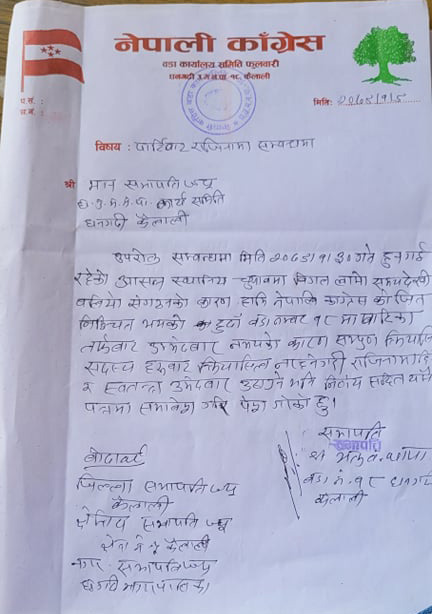 ‘विगत लामो समयदेखि बलियो संगठनका कारण नेपाली कांग्रेसको जित निश्चित भएको हुँदा वडा नम्बर १८ कमिटिका तर्फबाट उमेदवार नभएका कारण क्रियाशिल सदस्यबाट राजीनामा दिँदै स्वतन्त्र उमेदवार उठाउने निर्णय गरेका छौँ,’ राजीनामा पत्रमा उल्लेख गरिएको छ ।