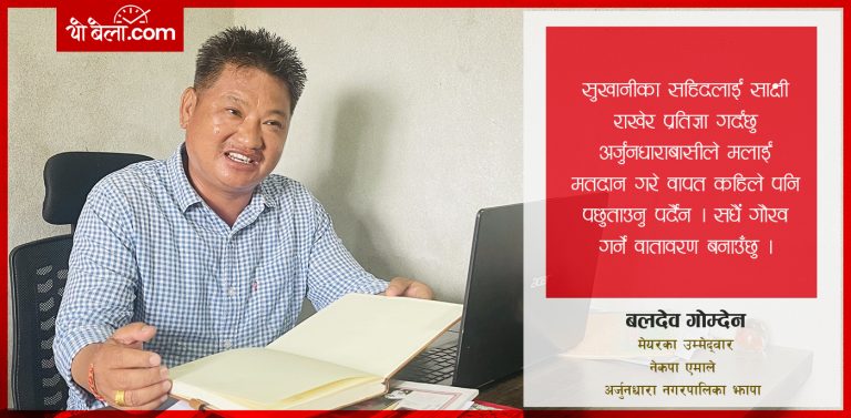 पूर्वी झापाको एउटा राजनीतिक भूमि हो अजुर्नधारा नगरपालिका । वर्गीय मुक्तिका लागि झापामा किसानहरुलाई जगाइरहेका युवाहरुलाई जेल सार्ने बहानामा यही नगरपालिकाको उत्तरी सिमा सुखानीमा लगेर हत्या गरिएको थियो । आज पनि एमालेको इतिहासमा सुखानी हत्याकाण्डका नामले चर्चित यो ठाउँ झापाको अजुर्नधारा नगरपालिका र इलामको माई नगरपालिकाको सिमानामा पर्दछ । सुखानीको सहिद स्तम्भ,सुखानी सहदि पार्क यही नगरपालिकामा पर्दछन् । त्यसैले यो नगरपालिकालाई झापा आन्दोलनको उद्धगम थलोको रुपमा पनि व्याख्या गरिन्छ । यस नगरपालिकाको मेयर एमालेको प्रतिष्ठा र सुखानीको विराससँग जोडिएको पद हो । विगतको निर्वाचनमा पनि एमलेले विरासत जोगएको थलो हो यो । त्यही विरासत जोगाउने जिम्मा यसपालि एमालेले बलदेव गोम्देनलाई दिएको छ । युवा नेता गोम्देन यस अघि वडा नं १०को वडा अध्यक्ष हुनुहुन्थ्यो । अजुर्नधारा एमालेको विरासतसँग मात्र सम्बिन्धत छैन । यो एउटा पौराणिक धार्मिक स्थल पनि हो । यहाँ महभरातको युद्धमा यहाँ अर्जुनले पानी खाएको हुनाले यस ठाउँलाई अर्जुनधारा भनिएको भन्ने किंवदन्ती पनि छ । राजनीतिक,धार्मिक र पर्यटकीय सम्भावना बोकेको अर्जुनधारा नगरपालिकाको नेतृत्व अब गोम्देनले गर्ने उत्साहका साथ चुनावी मैदानमा होमिनु भएको छ । दुई दशक भन्दा बढी झापा जिल्ला र अर्जुनधाराको पार्टी काम सहित निरन्तर क्रियाशिल सामाजिक क्षेत्रमा जोडिएका गोम्देन सर्वाधिक चर्चित युवा नेताका रूपमा गनिनुहुन्छ । बहुदलीय राजनीतिको जगबाट राजनीतिक जीवन आरम्भ गरेका अर्जुनधारा नगरपालिका वडा–१० को सफलतापूर्वक अध्यक्ष समालिसक्नु भएका गोम्देनले विभिन्न कामको सन्दर्भमा सिङ्गापुर, दुवई, पाकिस्तान, भुटान र भारत सहित नेपालका विभिन्न स्थानीय तहको स्थलगत अध्ययन/अवलोकन र अनुभव आर्जन गर्नुभएको छ । विषयवस्तुमा स्पष्ट कमाण्ड सहित सार्वजनिक जीवनमा समेत पेस हुने उहाँले तीन दर्जनभन्दा बढि सामाजिक संघसंसंस्थाको कुशलतापूर्वक नेतृत्व समालिसक्नु भएको अनुभव छ । तत्कालिन प्रजातान्त्रिक राष्ट्रिय युवा संघबाट राजनीतिक जीवन सुरुवात गर्नुभएका गोम्देनले संघको झापा जिल्ला कमिटी सदस्य, नेकपा एमालेको निर्वाचन क्षेत्रीय कमिटी सदस्यको जिम्मेवारी वहन गरिसक्नुएको छ । हाल पार्टीको अर्जुनधारा नगर कमिटीका अध्यक्ष रहनुभएका उहाँ सांगठनिक जिम्मेवारी भन्दा निकै फराकिलो पहिचान राख्नुहुन्छ । कालीस्थान माविको तीन कार्यकाल व्यवस्थापन समिति अध्यक्ष, शनिश्चरे बहुमुखी क्याम्पसको संस्थापक संचालक समिति सदस्य, तत्कालिन पूर्वाञ्चल खेलकुद विकास समितिको सदस्य, ससस्त्र प्रहरी बेस क्याम्प शनिश्चरे भवन निर्माण समिति अध्यक्ष, उज्यालो याताय