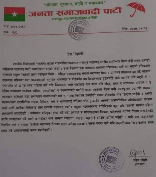 गठबन्धनको बैठकमा आफूहरूलाई नबोलाइएको र २९ वटै वडामा अध्यक्षसहित सदस्यहरूमा मनोमानी ढंगबाट सीट बाँडफाँट गरिएकाले गठबन्धनबाट बाहिरिएको जसपा भरतपुरका अध्यक्ष अनुज जोशीले बताउनु भयो ।