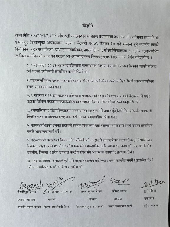 बैठकपछि जारी गठबन्धनका शीर्ष नेताको संयुक्त विज्ञप्ति