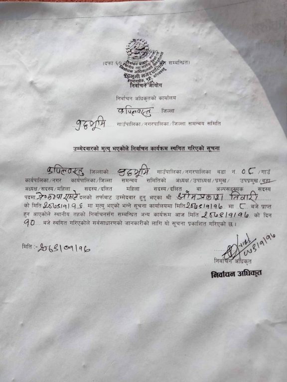कपिलवस्तु – वडाध्यक्षका उम्मेदवारको मृत्यु भएपछि कपिलवस्तुको बुद्धभूमि नगरपालिकामा स्थानीय तह निर्वाचन अन्तर्गत शनिबारको निर्वाचन कार्यक्रम स्थगित गरिएको छ ।