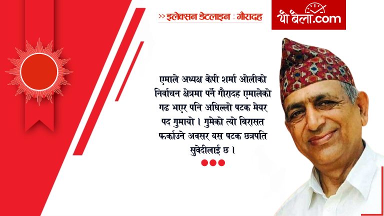 सत्ता पक्षीय गठबन्धनका बाबजुत पनि एमालेले राम्रो ‘पोजिसन’का उम्मेद्वार मेयरमा उठाएको छ । राजनीतिक सुझबुझ भएका मात्र होइन जननेता मदन भण्डारीका बालशखा एवं सहपाठी छत्रपति सुवेदी यो नगरबाट मेयरमा प्रतिष्पर्धा गर्दैहुनुहुन्छ । जननेता भण्डारी र सुवेदीले २०२१ र २०२२ सालमा कक्षा र ६ र ७ सँगै पढ्नु भएको हो । सुवेदीका अनुसार ताप्लेजुङको बालसुबोधिनी संस्ृकत माविमा दुईवर्ष उहाँहरु सँगै पढ्नुभयो । भत्केको किल्ला बनाउन एमालेले लामो राजनीति लिगेसी बोकेका सुवेदीलाई गौरादहमा अघि सारेको छ ।