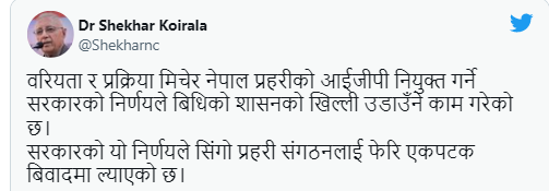 ‘वरीयता र प्रक्रिया मिचेर नेपाल प्रहरीको आईजीपी नियुक्त गर्ने सरकारको निर्णयले विधिको शासनको खिल्ली उडाउने काम गरेको छ’, कोइरालाले भन्नु भन्नुभयो, ‘सरकारको यो निर्णयले सिंगो प्रहरी संगठनलाई फेरि एकपटक विवादमा ल्याएको छ।’