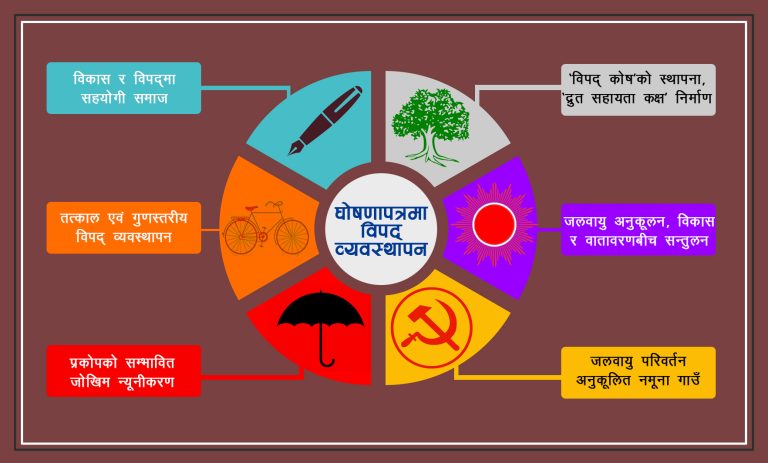 घोषणापत्रमा समग्र समुदाय तथा वडाकोसमेत सङ्कटापन्नता तथा क्षमता विश्लेषण गरी विपद् पूर्वतयारी तथा प्रतिकार्यको योजना बनाई कार्यान्वयन गरिने, डुबान, बाढी, पहिरो जस्ता विपद्बाट जनधनको क्षति कम गर्न पूर्वचेतावनी प्रणालीको विकास गरिने बताइएको छ । जोखिम संवेदनशील भूउपयोग विश्लेषण गरी जोखिमरहित स्थानमा मात्र बस्ती बसाउन आवश्यक कदम चालिने तथा विपद्बाट हुने आर्थिक एवं भौतिक क्षतिलाई सम्बोधन गर्न कृषि, घरेलु तथा साना उद्योगलाई सहुलियत दरमा बीमाको व्यवस्था गरिने घोषणापत्रमा समावेश छ ।