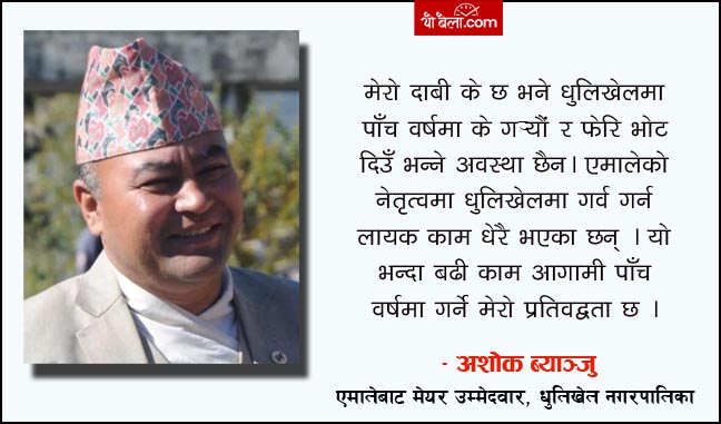 हामी जनप्रतिनिधिहरु शासक होइन, जनताका सेवक भएर काम गरेका छौ र अब फेरि पनि हामी सेवक हुनेछौं । सामाजिक जागरण र विकासका अभियन्ता भएर काम गर्ने, हाम्रो नगर सुशासनको नमूना नगर बनाउन, यसअघि रोकिएको भ्रष्टाचार नियन्त्रण गतिविधिलाई अब पनि कडाईका साथ नियन्त्रण गराउन, पाँच वर्ष भित्रमा दीगो विकास लक्ष्यका सबै सूचकहरु पूरा गरी स्वास्थ्य, शिक्षा, कृषि, आर्थिक, बाताबरणमा र गरीबी निबारणको क्षेत्रमा उल्लेख्य सुधार गरी नगरलाई दीगो विकास लक्ष्य पूरा गरिएको नगर घोषणा गर्न पुनः मेरो उम्मेदवारी हो । यो पाँच वर्षको अवधीमा धुलिखेल दक्षिण एशियाका १५ शहर भित्र पर्न सफल भएको छ भने अन्तराष्ट्रिय र राष्ट्रिय स्तरमा समेत नमुना घोषणा भएको छ ।