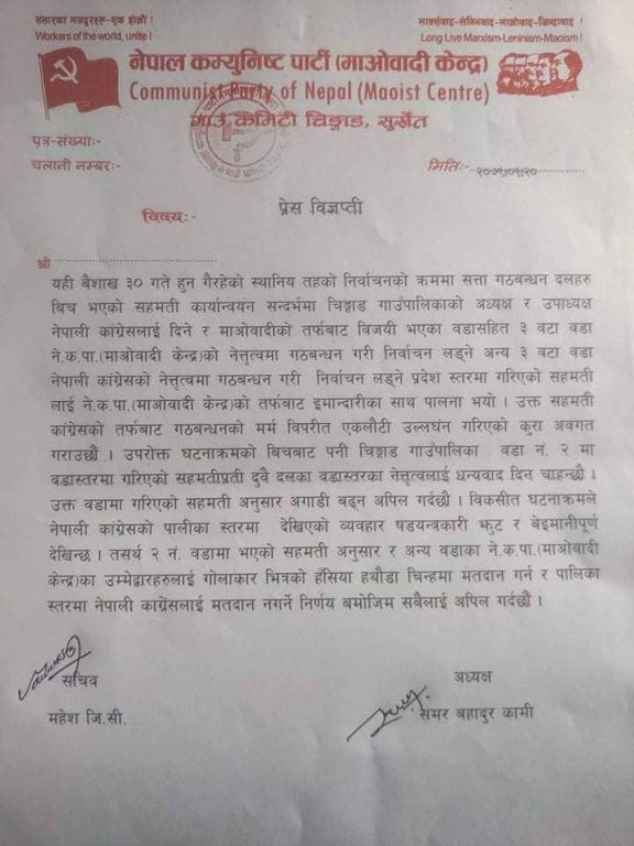 ‘चिङ्गाड गाउँपालिकाको अध्यक्ष र उपाध्यक्ष नेपाली कांग्रेसलाई दिने र माओवादीको तर्फबाट विजयी भएका वडासहित ३ वटा वडा माओवादी केन्द्रको नेतृत्वमा गठबन्धन गरी निर्वाचन लड्ने अन्य ३ वटा वडा नेपाली कांग्रेसको नेतृत्वमा गठबन्धन गरी निर्वाचन लड्ने प्रदेश स्तरमा गरिएको सहमतिलाई माओवादी केन्द्रको तर्फबाट इमान्दारीका साथ पालना भयो । तर उक्त सहमति कांग्रेसको तर्फबाट गठबन्धनको मर्मविपरीत एकलौटी उल्लंघन गरिएको कुरा अवगत गराउछौं’, विज्ञप्तिमा भनिएको छ।