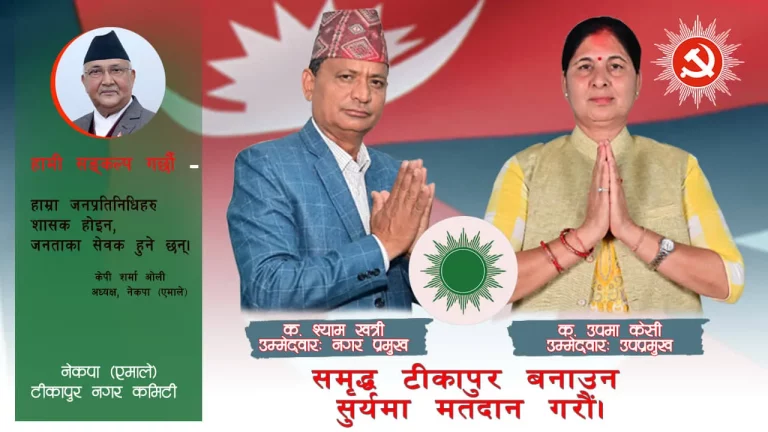 काठमाडौँ – टीकापुर नगरपालिकामा नेकपा एमालेका उम्मेदवारको पक्षमा उत्साह छाएको छ । एमालेले मेयरमा श्याम खत्री र उपमेयरमा उपमा केसीलाई उम्मेदवार बनाएको छ ।