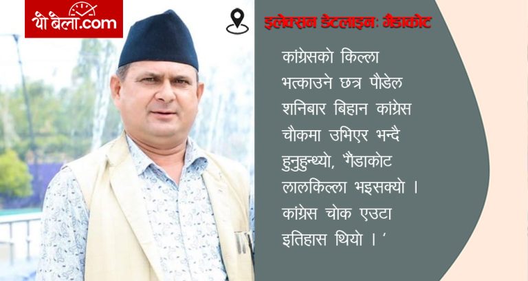 गैंडकोट कुनै बेला काँग्रेसको कस्तो गढ थियो भन्ने कुरा पूर्वपश्चिम राजमार्गको गौंडाकोट बजारमै ‘कांग्रेस चौक’ नामाकरण गरिएको छ । कांग्रेसको किल्ला भत्काउने उनै छत्र पौडेल शनिबार बिहान कांग्रेस चौकमा कार्यकर्ता सहित चुनावी अभियानमा भेटिनुभयो । पौडेलले यो बेलासँग भन्नुभयो, ‘गैंडाकोट लालकिल्ला भइसक्यो । कांग्रेस चोक एउटा इतिहास थियो । ’