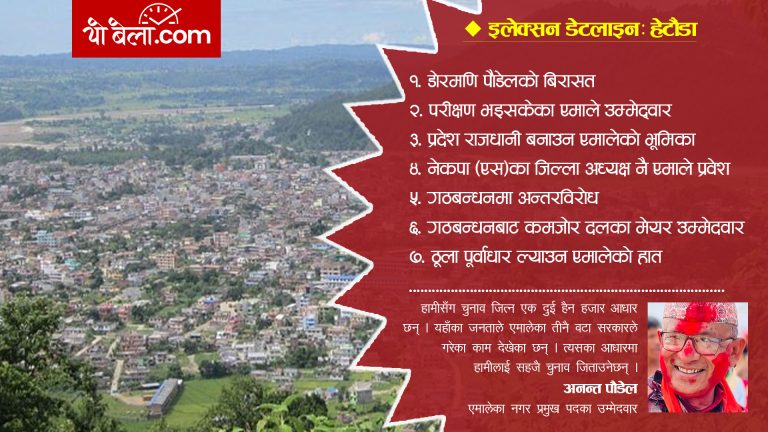 हेटौंडा– देशको संघीय राजधानी काठमाडौंको चुनावी चर्चा व्यापक रुपमा भइरहँदा बागमती प्रदेशको राजधानी हेटौंडाको चुनाव केही ओझेलमा परेको छ । तर हेटौंडा पुग्दा यो उपमहानगरलाई पनि उसैगरी चुनाव लागेको छ । एमालेको पुस्तौनी विरासत बोकेको यो उपमहानगरमा चुनाव जित्न एमालेलाई विगतका काम र डोरमणि पौडेल काफी रहेको एमालेजनहरु बताउँछन् ।