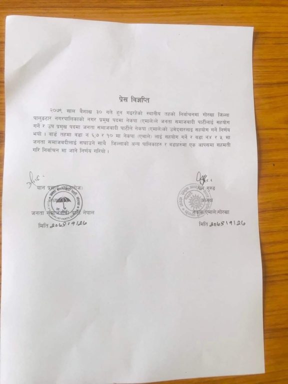 गोरखा– गोरखाको पालुङटार नगरपालिकामा नेकपा एमाले र जनता समाजवादी पार्टीबीच चुनावी तालमेल भएको छ ।