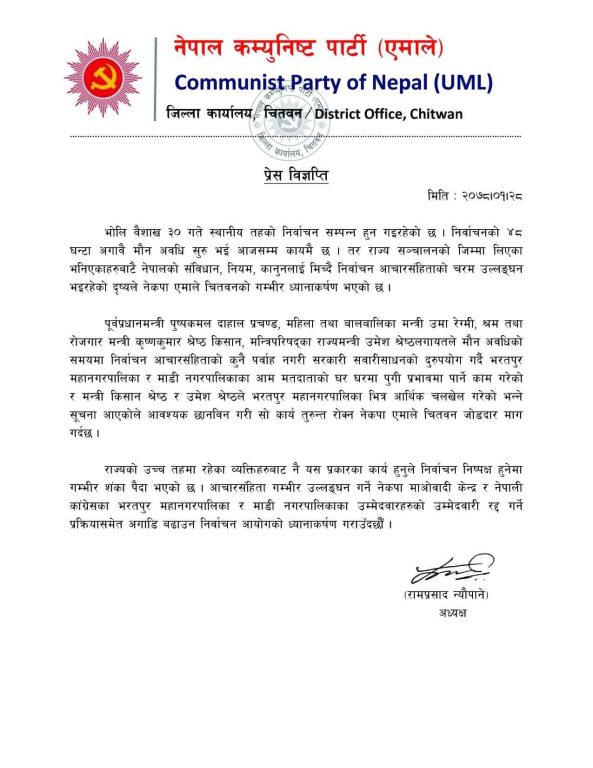 एमाले जिल्ला अध्यक्ष रामप्रसाद न्यौपानेले विज्ञप्ती जारी गर्दै मौन अवधिमा दाहालसहित मन्त्रीहरुले आचारसंहिताको चरम उल्लङ्घन गरिरहेको आरोप लगाउनुभएको छ ।