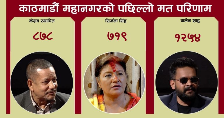 निकटतम् प्रतिद्धन्दी एमालेका केशव स्थापितले ८७८ मत ल्याउनुभएको छ । तेस्रोमा कांग्रेसकी सिर्जना सिंहले ७१९ मत पाउनुभएको छ ।