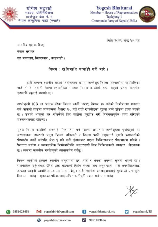 एमाले सचिव तथा ताप्लेजुङबाट प्रतिनिधि सभा सदस्य योगेश भट्टराईको नेतृत्वमा मंगलबार गृह मन्त्रालय पुगेको प्रतिनिधिमसँग कुराकानी गर्दै गृहमन्त्री खाँणले घटनाको सुस्म रूपमा अनुसन्धान गरिने बताउनुभयो ।