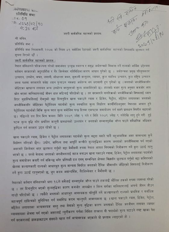 प्रमुख प्रतिपक्षी दल नेकपा एमाले र राप्रपाका सांसदले पेट्रोलियम पदार्थ, इन्धन र खाना पकाउने ग्यासको मूल्यवृद्धिमाथि संसद्मा छलफलको माग गर्दै प्रतिनिधिसभामा जरुरी सार्वजनिक महत्त्वको प्रस्ताव दर्ता गराउनु भएको हो ।