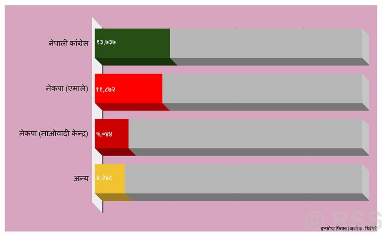 गत वैशाखमा सम्पन्न निर्वाचनमा कांग्रेसबाट १४० प्रमुख, ११० उपप्रमुख, १८८ अध्यक्ष, १९० उपाध्यक्ष, दुई हजार ६६१ वडाध्यक्ष, दुई हजार ६०० महिला सदस्य, दुई हजार ५४७ दलित महिला सदस्य र वडा सदस्य पाँच हजार ३०१ निर्वाचित भएका छन् । एमालेबाट ८२ प्रमुख, ११३ उपप्रमुख, १२३ अध्यक्ष, १२६ उपाध्यक्ष, दुई हजार १२७ वडाध्यक्ष, दुई हजार ३४० महिला सदस्य, दुई हजार २८५ दलित महिला सदस्य र चार हजार ६७६ वडा सदस्य निर्वाचित भएका छन् ।