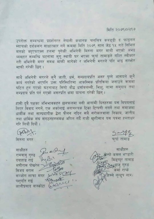 ‘प्रदर्शनरत नेपाली कथानक चलचित्र कबडडी द फाइनल म्याचको दर्शकसँग साक्षात्कार गर्ने क्रममा मिति २०७९ साल जेठ १५ गते सिभिल मलको क्युएफएक्स हलमा पुगेकी अभिनेत्री मिरुना मगरमाथि भएको अभद्र व्यवहार सम्बन्धी घटनामा मुग स्थायी घर भएका फुर्पा तामाङले गल्ती स्वीकार गरी अभिनेत्री समक्ष माफी मागेका र अभिनेत्री मगरले पनि भाइ सम्झेर माफी दिएको छ’, सहमति पत्रमा भनिएको छ।